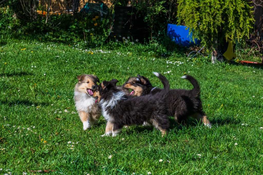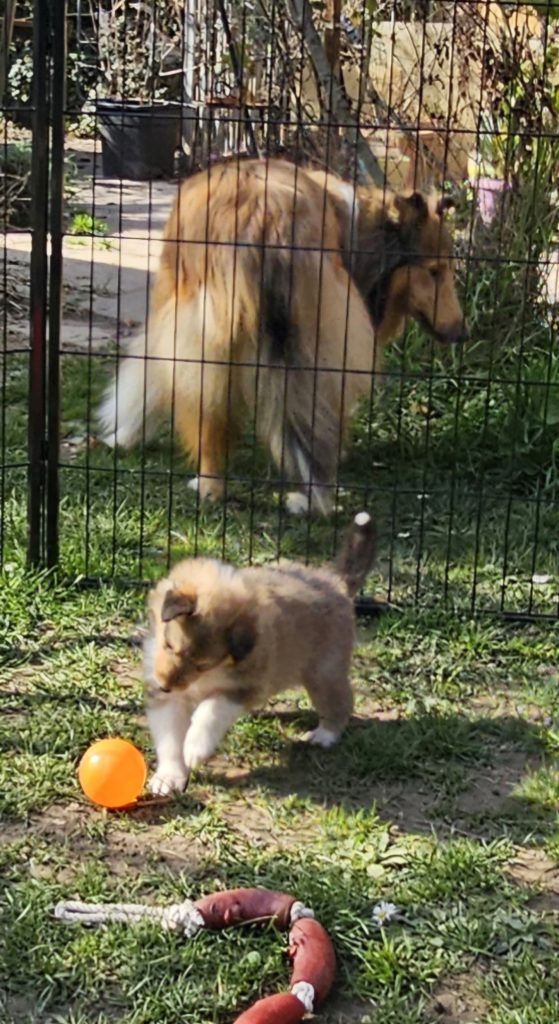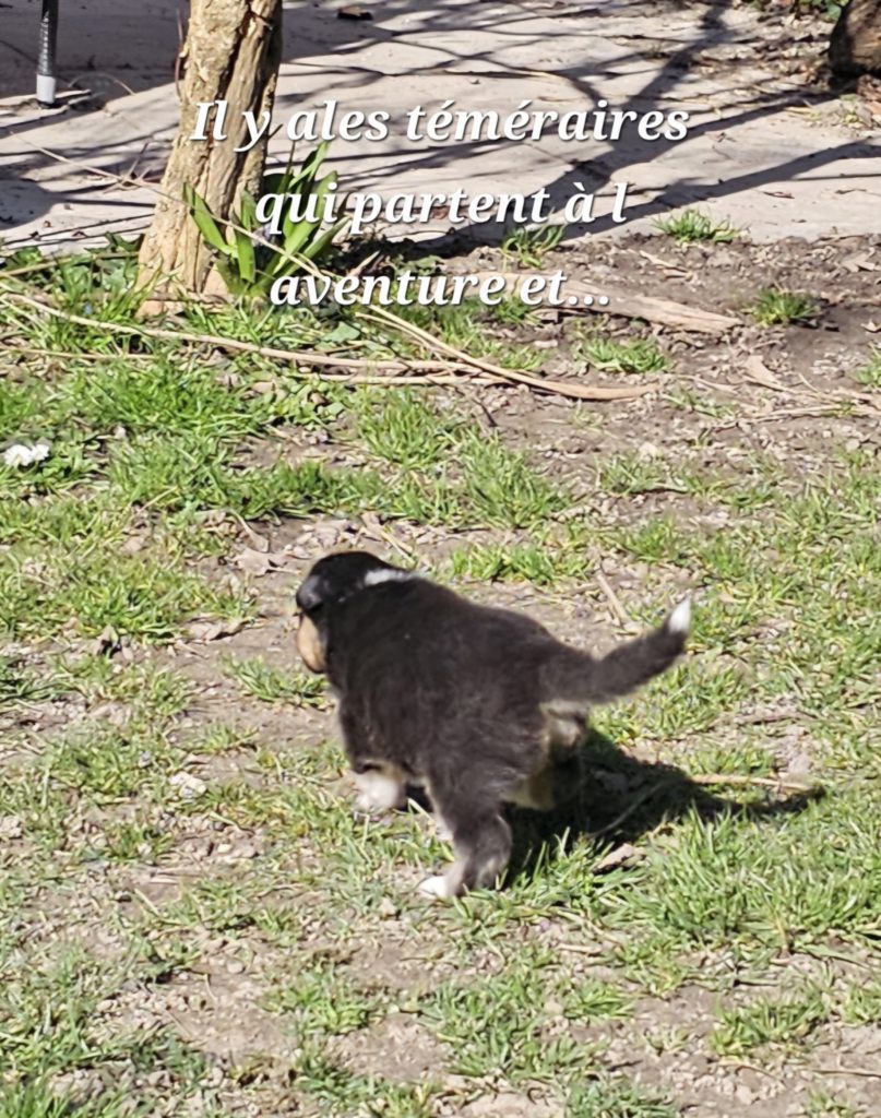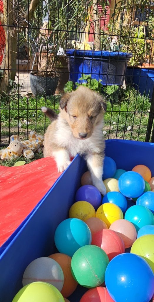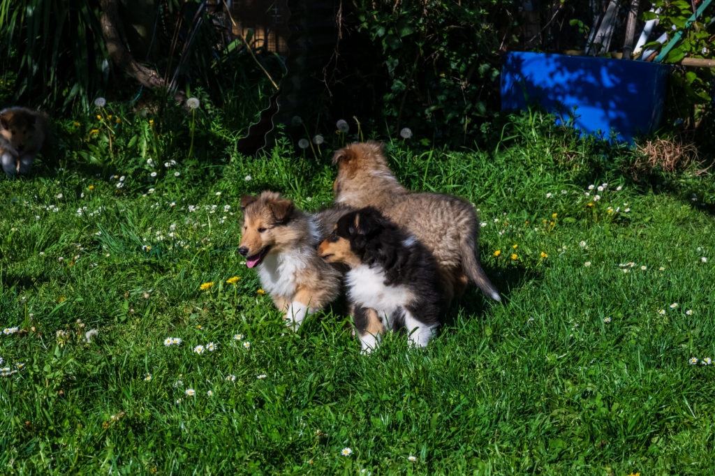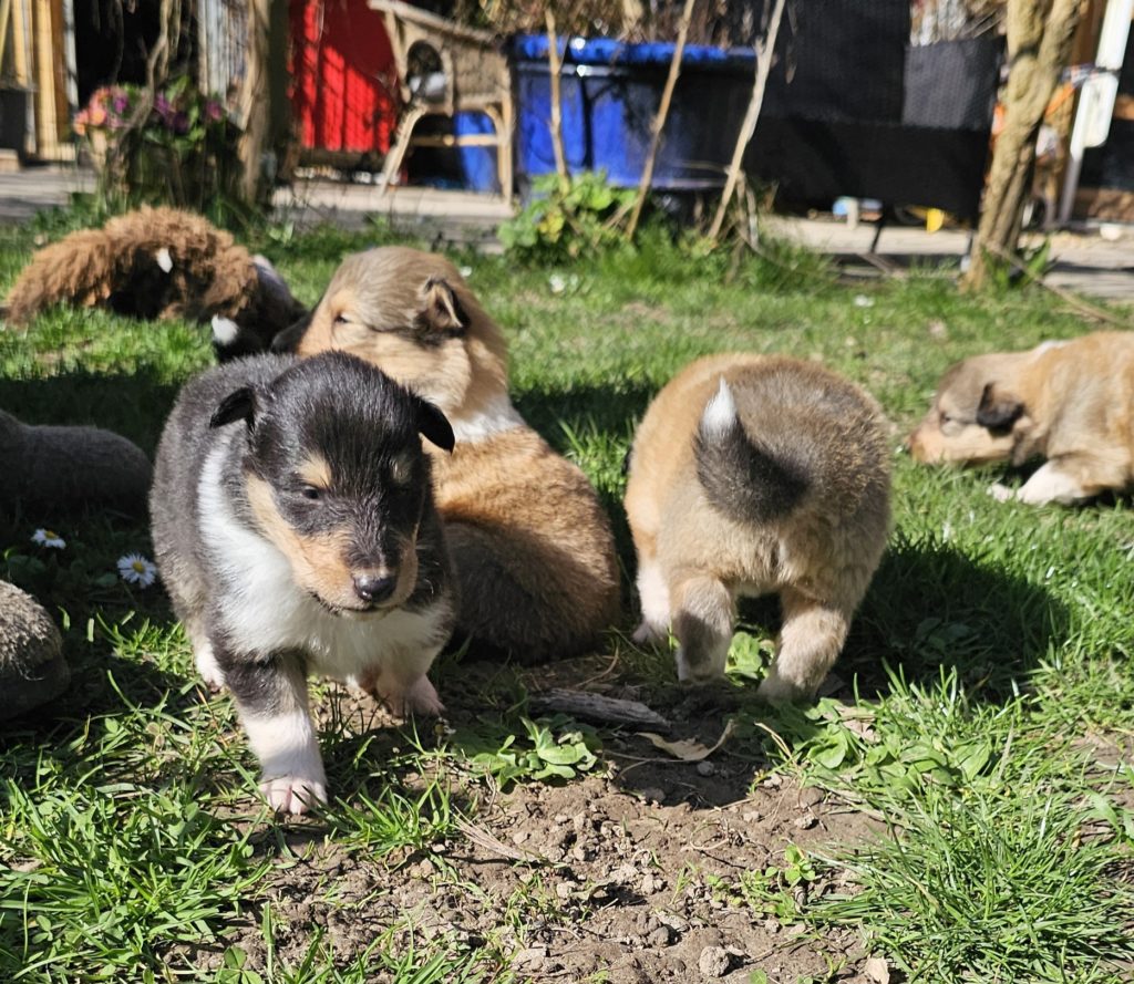 4 semaines et nous passons de plus en plus de temps dehors. Plusieurs chiots cherchent encore leur famille...