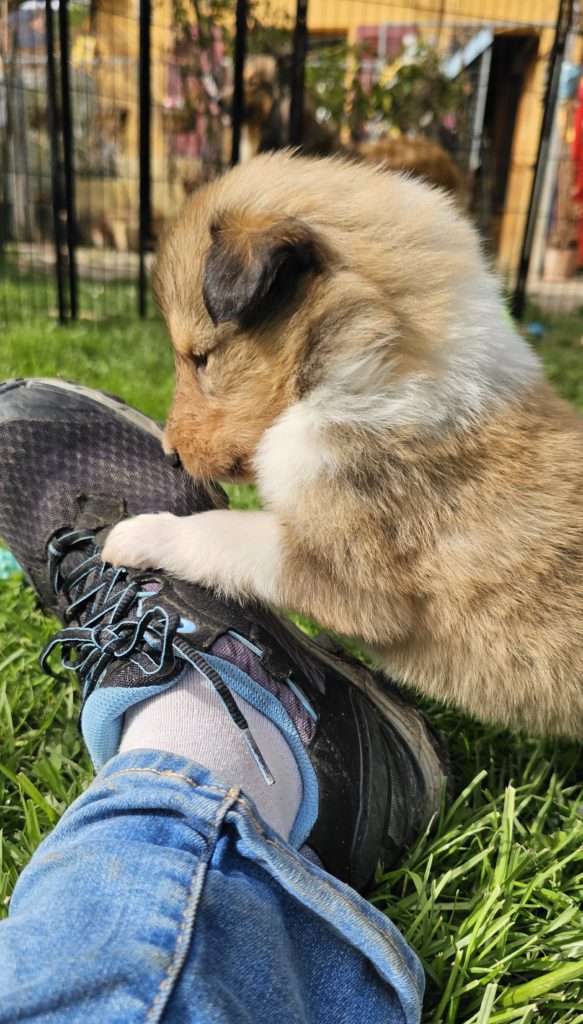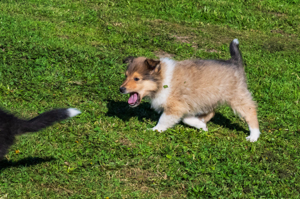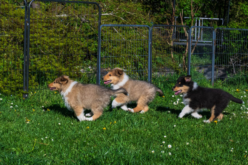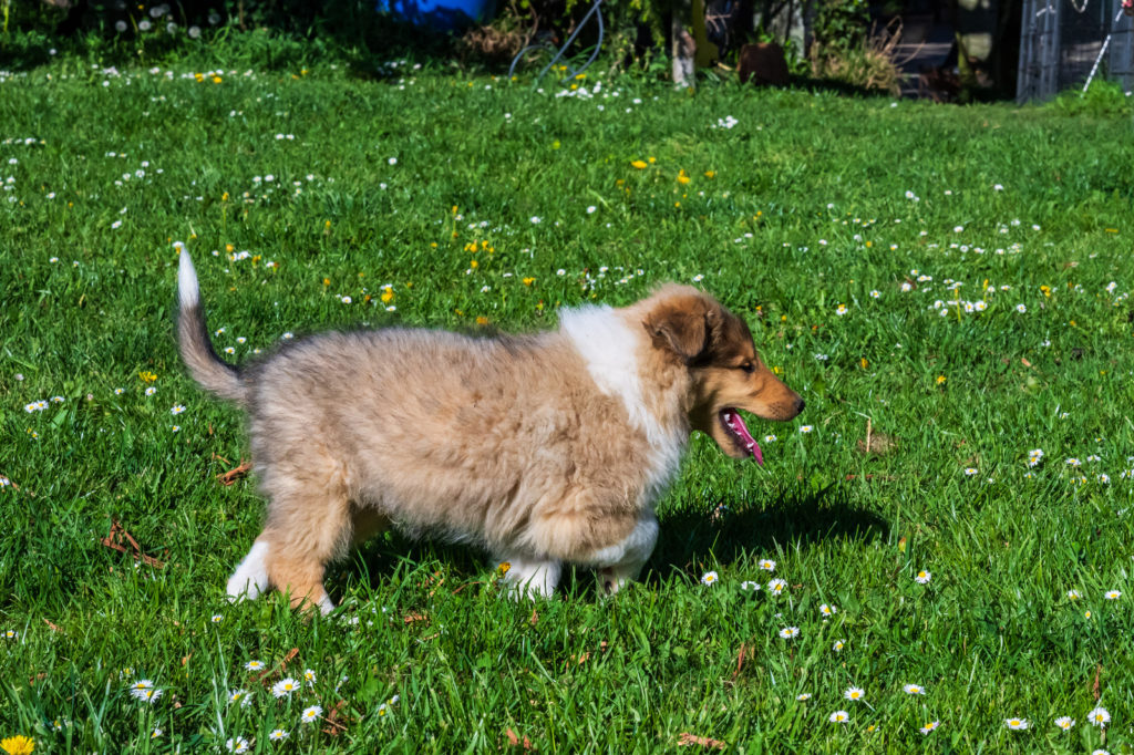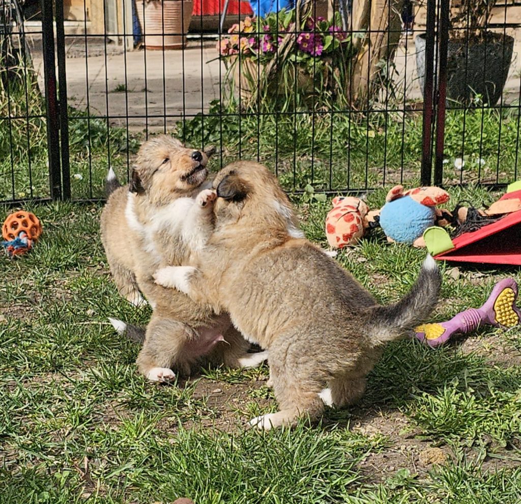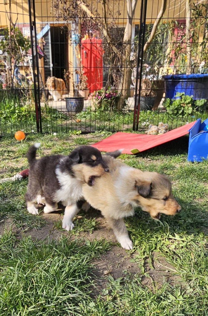 4 semaines et nous passons de plus en plus de temps dehors. Plusieurs chiots cherchent encore leur famille...